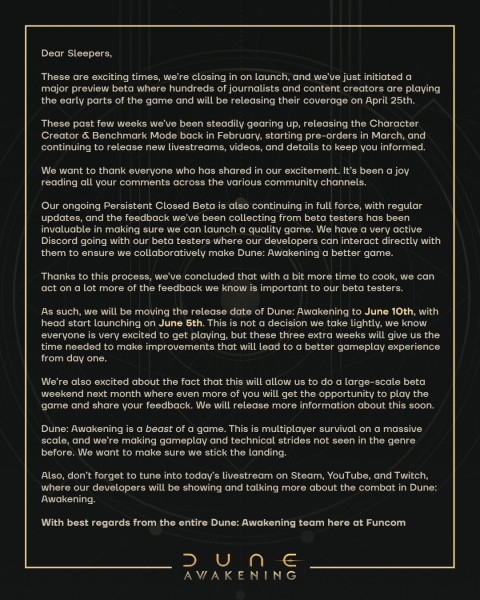 “Dune: Awakening is a beast of a game,” says Funcom in a statement. “This is multiplayer survival on a massive scale, and we’re making gameplay and technical strides not seen in the genre before. We want to make sure we stick the landing.”